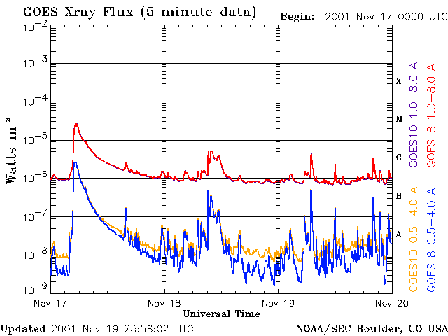 De operationele data in de bovenstaande grafiek werd aangepast om de schaalfactor te verwijderen die werd toegepast door het Space Weather Prediction Center (SWPC). Vanwege de SWPC-schaalfactor in de operationele data werden de zonnevlammen 42% kleiner gerapporteerd dan deze in de wetenschappelijke data. De schaalfactor werd ook verwijderd uit de lijst met zonnevlammen om de werkelijke fysieke eenheden weer te geven.