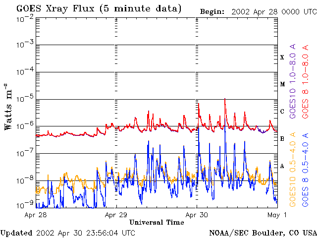 De operationele data in de bovenstaande grafiek werd aangepast om de schaalfactor te verwijderen die werd toegepast door het Space Weather Prediction Center (SWPC). Vanwege de SWPC-schaalfactor in de operationele data werden de zonnevlammen 42% kleiner gerapporteerd dan deze in de wetenschappelijke data. De schaalfactor werd ook verwijderd uit de lijst met zonnevlammen om de werkelijke fysieke eenheden weer te geven.