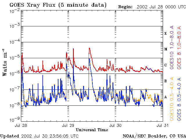 De operationele data in de bovenstaande grafiek werd aangepast om de schaalfactor te verwijderen die werd toegepast door het Space Weather Prediction Center (SWPC). Vanwege de SWPC-schaalfactor in de operationele data werden de zonnevlammen 42% kleiner gerapporteerd dan deze in de wetenschappelijke data. De schaalfactor werd ook verwijderd uit de lijst met zonnevlammen om de werkelijke fysieke eenheden weer te geven.