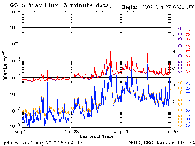 De operationele data in de bovenstaande grafiek werd aangepast om de schaalfactor te verwijderen die werd toegepast door het Space Weather Prediction Center (SWPC). Vanwege de SWPC-schaalfactor in de operationele data werden de zonnevlammen 42% kleiner gerapporteerd dan deze in de wetenschappelijke data. De schaalfactor werd ook verwijderd uit de lijst met zonnevlammen om de werkelijke fysieke eenheden weer te geven.