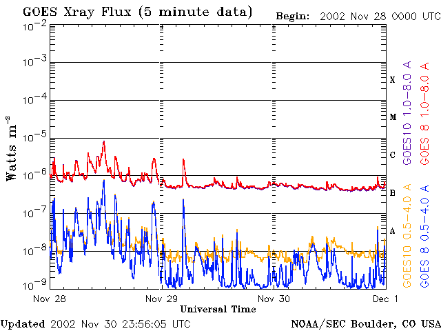 De operationele data in de bovenstaande grafiek werd aangepast om de schaalfactor te verwijderen die werd toegepast door het Space Weather Prediction Center (SWPC). Vanwege de SWPC-schaalfactor in de operationele data werden de zonnevlammen 42% kleiner gerapporteerd dan deze in de wetenschappelijke data. De schaalfactor werd ook verwijderd uit de lijst met zonnevlammen om de werkelijke fysieke eenheden weer te geven.