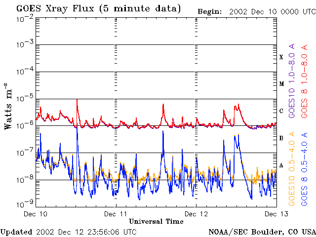 De operationele data in de bovenstaande grafiek werd aangepast om de schaalfactor te verwijderen die werd toegepast door het Space Weather Prediction Center (SWPC). Vanwege de SWPC-schaalfactor in de operationele data werden de zonnevlammen 42% kleiner gerapporteerd dan deze in de wetenschappelijke data. De schaalfactor werd ook verwijderd uit de lijst met zonnevlammen om de werkelijke fysieke eenheden weer te geven.