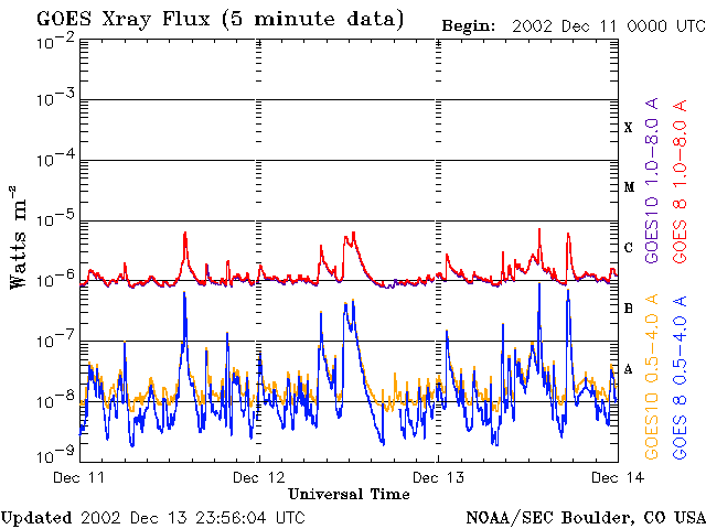 De operationele data in de bovenstaande grafiek werd aangepast om de schaalfactor te verwijderen die werd toegepast door het Space Weather Prediction Center (SWPC). Vanwege de SWPC-schaalfactor in de operationele data werden de zonnevlammen 42% kleiner gerapporteerd dan deze in de wetenschappelijke data. De schaalfactor werd ook verwijderd uit de lijst met zonnevlammen om de werkelijke fysieke eenheden weer te geven.