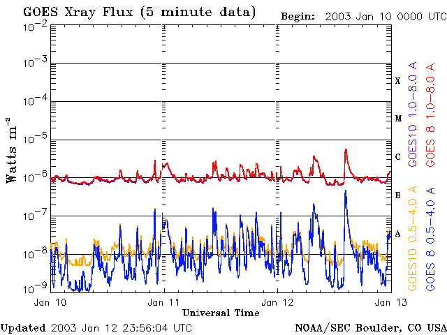 De operationele data in de bovenstaande grafiek werd aangepast om de schaalfactor te verwijderen die werd toegepast door het Space Weather Prediction Center (SWPC). Vanwege de SWPC-schaalfactor in de operationele data werden de zonnevlammen 42% kleiner gerapporteerd dan deze in de wetenschappelijke data. De schaalfactor werd ook verwijderd uit de lijst met zonnevlammen om de werkelijke fysieke eenheden weer te geven.
