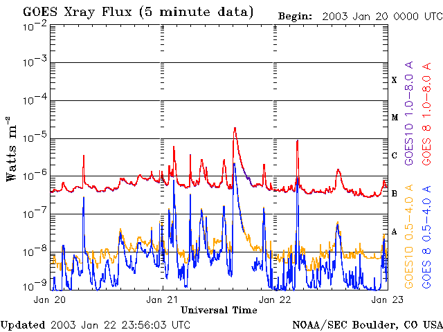 De operationele data in de bovenstaande grafiek werd aangepast om de schaalfactor te verwijderen die werd toegepast door het Space Weather Prediction Center (SWPC). Vanwege de SWPC-schaalfactor in de operationele data werden de zonnevlammen 42% kleiner gerapporteerd dan deze in de wetenschappelijke data. De schaalfactor werd ook verwijderd uit de lijst met zonnevlammen om de werkelijke fysieke eenheden weer te geven.