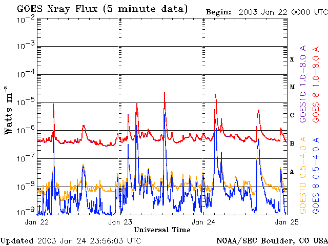 De operationele data in de bovenstaande grafiek werd aangepast om de schaalfactor te verwijderen die werd toegepast door het Space Weather Prediction Center (SWPC). Vanwege de SWPC-schaalfactor in de operationele data werden de zonnevlammen 42% kleiner gerapporteerd dan deze in de wetenschappelijke data. De schaalfactor werd ook verwijderd uit de lijst met zonnevlammen om de werkelijke fysieke eenheden weer te geven.