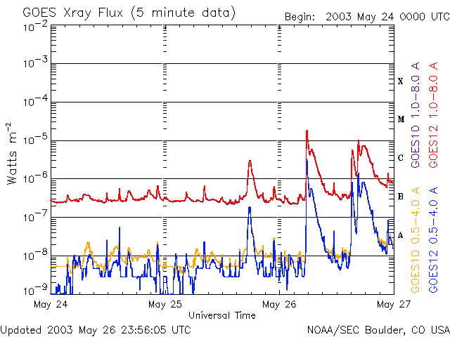 De operationele data in de bovenstaande grafiek werd aangepast om de schaalfactor te verwijderen die werd toegepast door het Space Weather Prediction Center (SWPC). Vanwege de SWPC-schaalfactor in de operationele data werden de zonnevlammen 42% kleiner gerapporteerd dan deze in de wetenschappelijke data. De schaalfactor werd ook verwijderd uit de lijst met zonnevlammen om de werkelijke fysieke eenheden weer te geven.