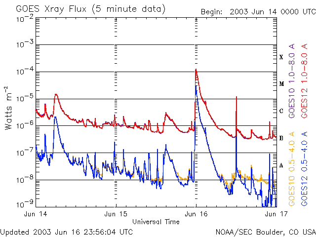 De operationele data in de bovenstaande grafiek werd aangepast om de schaalfactor te verwijderen die werd toegepast door het Space Weather Prediction Center (SWPC). Vanwege de SWPC-schaalfactor in de operationele data werden de zonnevlammen 42% kleiner gerapporteerd dan deze in de wetenschappelijke data. De schaalfactor werd ook verwijderd uit de lijst met zonnevlammen om de werkelijke fysieke eenheden weer te geven.