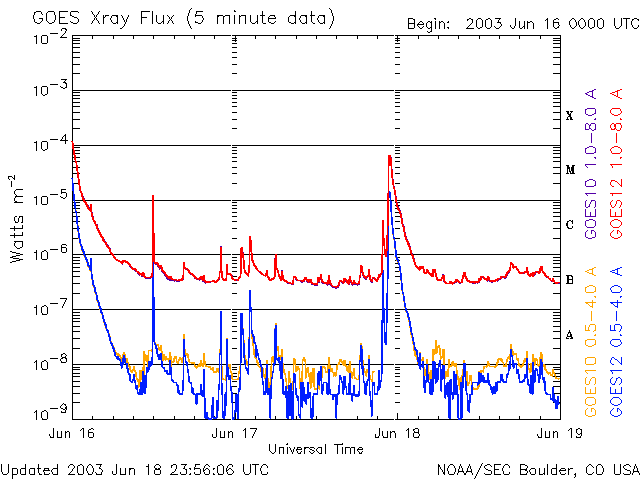De operationele data in de bovenstaande grafiek werd aangepast om de schaalfactor te verwijderen die werd toegepast door het Space Weather Prediction Center (SWPC). Vanwege de SWPC-schaalfactor in de operationele data werden de zonnevlammen 42% kleiner gerapporteerd dan deze in de wetenschappelijke data. De schaalfactor werd ook verwijderd uit de lijst met zonnevlammen om de werkelijke fysieke eenheden weer te geven.