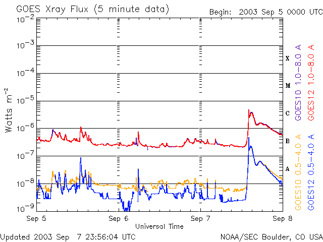 De operationele data in de bovenstaande grafiek werd aangepast om de schaalfactor te verwijderen die werd toegepast door het Space Weather Prediction Center (SWPC). Vanwege de SWPC-schaalfactor in de operationele data werden de zonnevlammen 42% kleiner gerapporteerd dan deze in de wetenschappelijke data. De schaalfactor werd ook verwijderd uit de lijst met zonnevlammen om de werkelijke fysieke eenheden weer te geven.