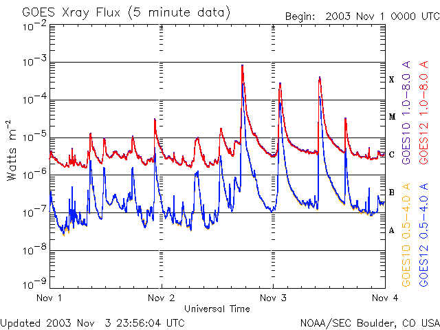 De operationele data in de bovenstaande grafiek werd aangepast om de schaalfactor te verwijderen die werd toegepast door het Space Weather Prediction Center (SWPC). Vanwege de SWPC-schaalfactor in de operationele data werden de zonnevlammen 42% kleiner gerapporteerd dan deze in de wetenschappelijke data. De schaalfactor werd ook verwijderd uit de lijst met zonnevlammen om de werkelijke fysieke eenheden weer te geven.