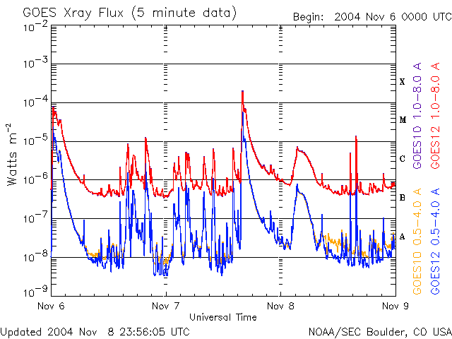 De operationele data in de bovenstaande grafiek werd aangepast om de schaalfactor te verwijderen die werd toegepast door het Space Weather Prediction Center (SWPC). Vanwege de SWPC-schaalfactor in de operationele data werden de zonnevlammen 42% kleiner gerapporteerd dan deze in de wetenschappelijke data. De schaalfactor werd ook verwijderd uit de lijst met zonnevlammen om de werkelijke fysieke eenheden weer te geven.