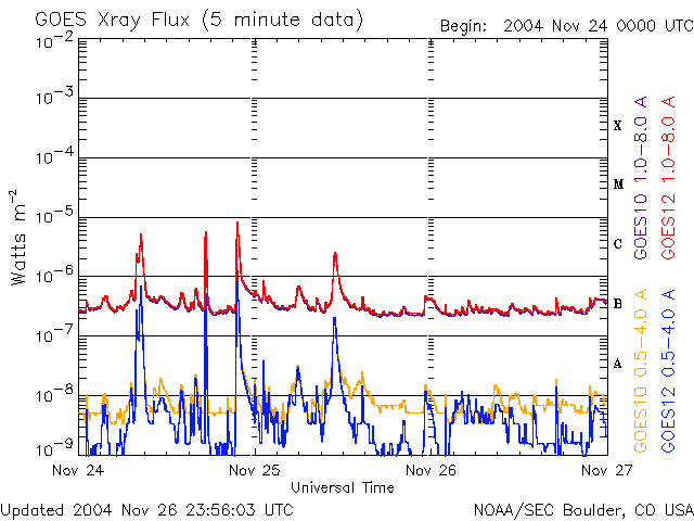 De operationele data in de bovenstaande grafiek werd aangepast om de schaalfactor te verwijderen die werd toegepast door het Space Weather Prediction Center (SWPC). Vanwege de SWPC-schaalfactor in de operationele data werden de zonnevlammen 42% kleiner gerapporteerd dan deze in de wetenschappelijke data. De schaalfactor werd ook verwijderd uit de lijst met zonnevlammen om de werkelijke fysieke eenheden weer te geven.