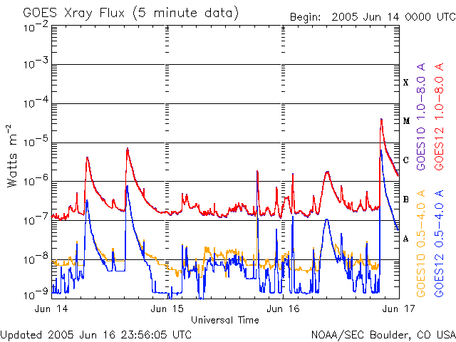 De operationele data in de bovenstaande grafiek werd aangepast om de schaalfactor te verwijderen die werd toegepast door het Space Weather Prediction Center (SWPC). Vanwege de SWPC-schaalfactor in de operationele data werden de zonnevlammen 42% kleiner gerapporteerd dan deze in de wetenschappelijke data. De schaalfactor werd ook verwijderd uit de lijst met zonnevlammen om de werkelijke fysieke eenheden weer te geven.