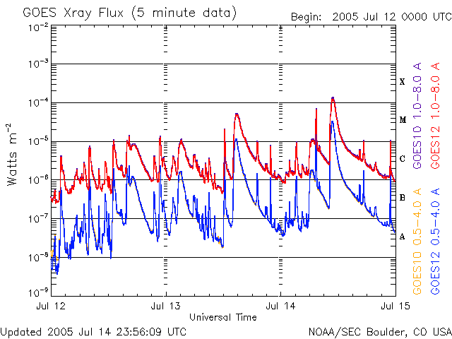 De operationele data in de bovenstaande grafiek werd aangepast om de schaalfactor te verwijderen die werd toegepast door het Space Weather Prediction Center (SWPC). Vanwege de SWPC-schaalfactor in de operationele data werden de zonnevlammen 42% kleiner gerapporteerd dan deze in de wetenschappelijke data. De schaalfactor werd ook verwijderd uit de lijst met zonnevlammen om de werkelijke fysieke eenheden weer te geven.