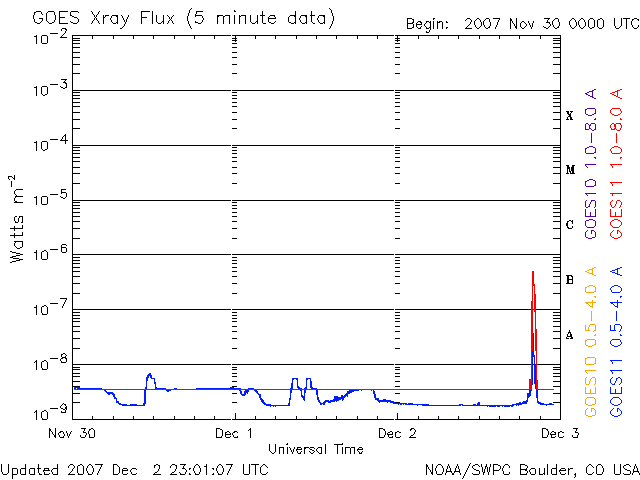 De operationele data in de bovenstaande grafiek werd aangepast om de schaalfactor te verwijderen die werd toegepast door het Space Weather Prediction Center (SWPC). Vanwege de SWPC-schaalfactor in de operationele data werden de zonnevlammen 42% kleiner gerapporteerd dan deze in de wetenschappelijke data. De schaalfactor werd ook verwijderd uit de lijst met zonnevlammen om de werkelijke fysieke eenheden weer te geven.