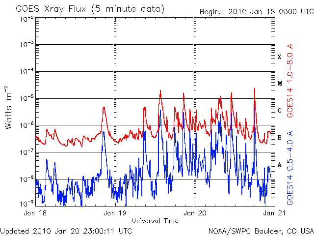 De operationele data in de bovenstaande grafiek werd aangepast om de schaalfactor te verwijderen die werd toegepast door het Space Weather Prediction Center (SWPC). Vanwege de SWPC-schaalfactor in de operationele data werden de zonnevlammen 42% kleiner gerapporteerd dan deze in de wetenschappelijke data. De schaalfactor werd ook verwijderd uit de lijst met zonnevlammen om de werkelijke fysieke eenheden weer te geven.