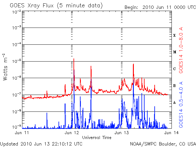 De operationele data in de bovenstaande grafiek werd aangepast om de schaalfactor te verwijderen die werd toegepast door het Space Weather Prediction Center (SWPC). Vanwege de SWPC-schaalfactor in de operationele data werden de zonnevlammen 42% kleiner gerapporteerd dan deze in de wetenschappelijke data. De schaalfactor werd ook verwijderd uit de lijst met zonnevlammen om de werkelijke fysieke eenheden weer te geven.