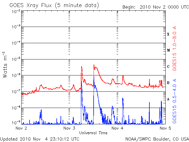 De operationele data in de bovenstaande grafiek werd aangepast om de schaalfactor te verwijderen die werd toegepast door het Space Weather Prediction Center (SWPC). Vanwege de SWPC-schaalfactor in de operationele data werden de zonnevlammen 42% kleiner gerapporteerd dan deze in de wetenschappelijke data. De schaalfactor werd ook verwijderd uit de lijst met zonnevlammen om de werkelijke fysieke eenheden weer te geven.