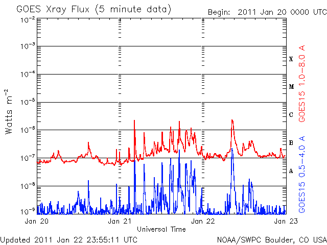 De operationele data in de bovenstaande grafiek werd aangepast om de schaalfactor te verwijderen die werd toegepast door het Space Weather Prediction Center (SWPC). Vanwege de SWPC-schaalfactor in de operationele data werden de zonnevlammen 42% kleiner gerapporteerd dan deze in de wetenschappelijke data. De schaalfactor werd ook verwijderd uit de lijst met zonnevlammen om de werkelijke fysieke eenheden weer te geven.