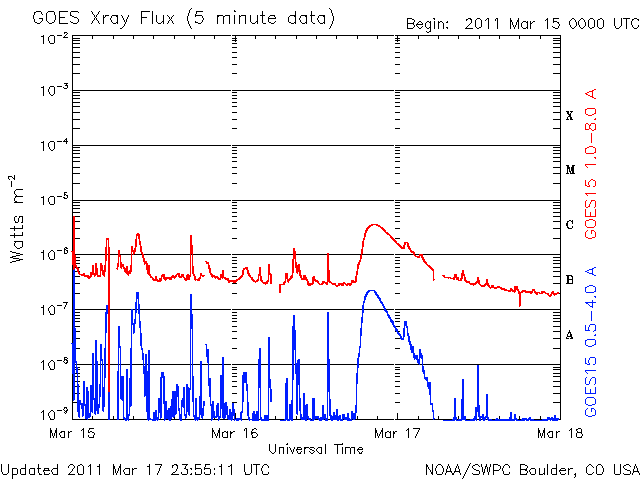 De operationele data in de bovenstaande grafiek werd aangepast om de schaalfactor te verwijderen die werd toegepast door het Space Weather Prediction Center (SWPC). Vanwege de SWPC-schaalfactor in de operationele data werden de zonnevlammen 42% kleiner gerapporteerd dan deze in de wetenschappelijke data. De schaalfactor werd ook verwijderd uit de lijst met zonnevlammen om de werkelijke fysieke eenheden weer te geven.