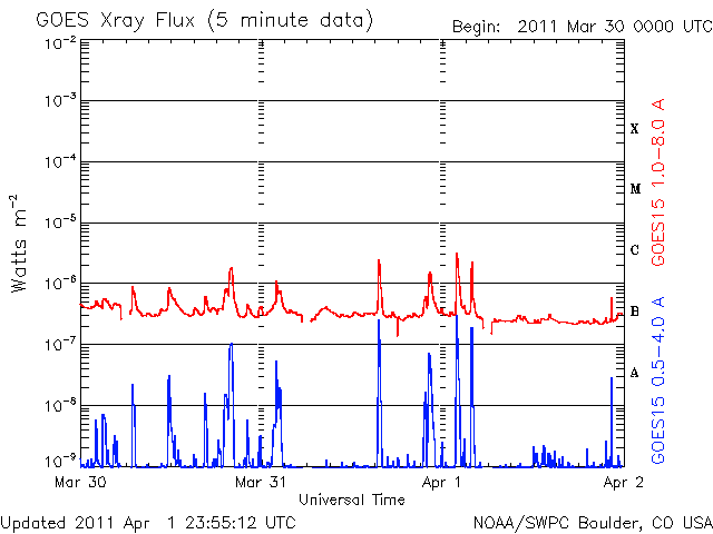 De operationele data in de bovenstaande grafiek werd aangepast om de schaalfactor te verwijderen die werd toegepast door het Space Weather Prediction Center (SWPC). Vanwege de SWPC-schaalfactor in de operationele data werden de zonnevlammen 42% kleiner gerapporteerd dan deze in de wetenschappelijke data. De schaalfactor werd ook verwijderd uit de lijst met zonnevlammen om de werkelijke fysieke eenheden weer te geven.