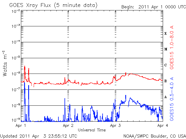 De operationele data in de bovenstaande grafiek werd aangepast om de schaalfactor te verwijderen die werd toegepast door het Space Weather Prediction Center (SWPC). Vanwege de SWPC-schaalfactor in de operationele data werden de zonnevlammen 42% kleiner gerapporteerd dan deze in de wetenschappelijke data. De schaalfactor werd ook verwijderd uit de lijst met zonnevlammen om de werkelijke fysieke eenheden weer te geven.