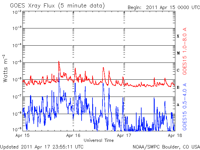 De operationele data in de bovenstaande grafiek werd aangepast om de schaalfactor te verwijderen die werd toegepast door het Space Weather Prediction Center (SWPC). Vanwege de SWPC-schaalfactor in de operationele data werden de zonnevlammen 42% kleiner gerapporteerd dan deze in de wetenschappelijke data. De schaalfactor werd ook verwijderd uit de lijst met zonnevlammen om de werkelijke fysieke eenheden weer te geven.