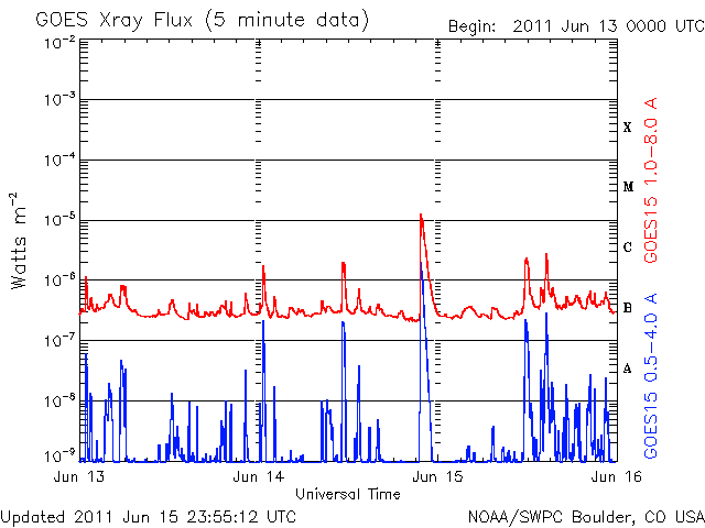 De operationele data in de bovenstaande grafiek werd aangepast om de schaalfactor te verwijderen die werd toegepast door het Space Weather Prediction Center (SWPC). Vanwege de SWPC-schaalfactor in de operationele data werden de zonnevlammen 42% kleiner gerapporteerd dan deze in de wetenschappelijke data. De schaalfactor werd ook verwijderd uit de lijst met zonnevlammen om de werkelijke fysieke eenheden weer te geven.