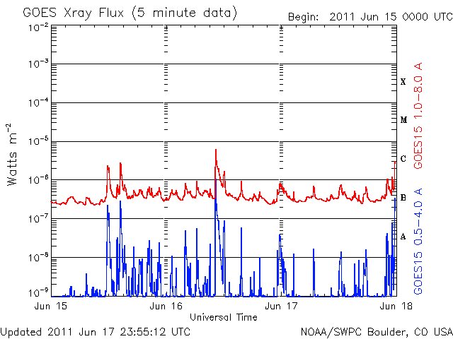 De operationele data in de bovenstaande grafiek werd aangepast om de schaalfactor te verwijderen die werd toegepast door het Space Weather Prediction Center (SWPC). Vanwege de SWPC-schaalfactor in de operationele data werden de zonnevlammen 42% kleiner gerapporteerd dan deze in de wetenschappelijke data. De schaalfactor werd ook verwijderd uit de lijst met zonnevlammen om de werkelijke fysieke eenheden weer te geven.