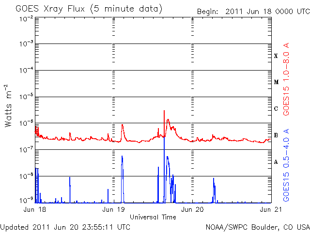 De operationele data in de bovenstaande grafiek werd aangepast om de schaalfactor te verwijderen die werd toegepast door het Space Weather Prediction Center (SWPC). Vanwege de SWPC-schaalfactor in de operationele data werden de zonnevlammen 42% kleiner gerapporteerd dan deze in de wetenschappelijke data. De schaalfactor werd ook verwijderd uit de lijst met zonnevlammen om de werkelijke fysieke eenheden weer te geven.