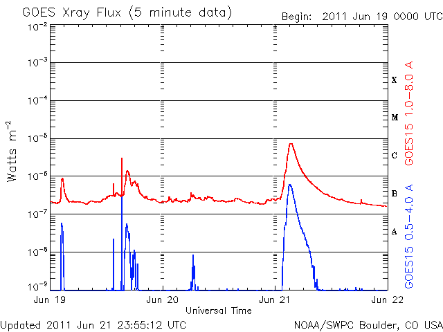 De operationele data in de bovenstaande grafiek werd aangepast om de schaalfactor te verwijderen die werd toegepast door het Space Weather Prediction Center (SWPC). Vanwege de SWPC-schaalfactor in de operationele data werden de zonnevlammen 42% kleiner gerapporteerd dan deze in de wetenschappelijke data. De schaalfactor werd ook verwijderd uit de lijst met zonnevlammen om de werkelijke fysieke eenheden weer te geven.