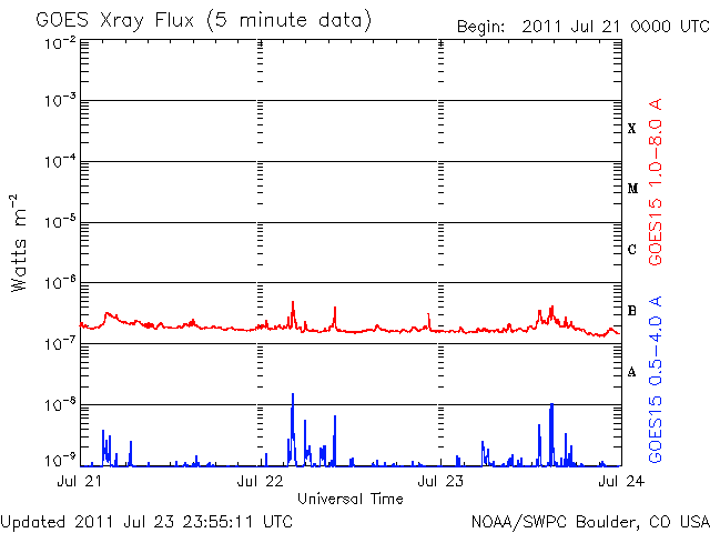 De operationele data in de bovenstaande grafiek werd aangepast om de schaalfactor te verwijderen die werd toegepast door het Space Weather Prediction Center (SWPC). Vanwege de SWPC-schaalfactor in de operationele data werden de zonnevlammen 42% kleiner gerapporteerd dan deze in de wetenschappelijke data. De schaalfactor werd ook verwijderd uit de lijst met zonnevlammen om de werkelijke fysieke eenheden weer te geven.
