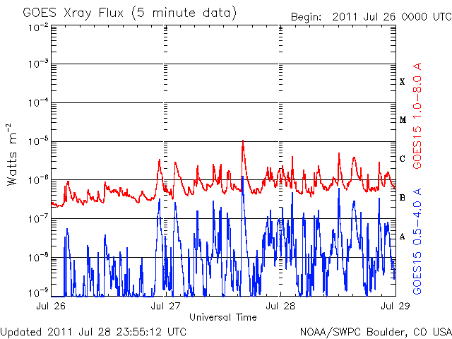 De operationele data in de bovenstaande grafiek werd aangepast om de schaalfactor te verwijderen die werd toegepast door het Space Weather Prediction Center (SWPC). Vanwege de SWPC-schaalfactor in de operationele data werden de zonnevlammen 42% kleiner gerapporteerd dan deze in de wetenschappelijke data. De schaalfactor werd ook verwijderd uit de lijst met zonnevlammen om de werkelijke fysieke eenheden weer te geven.