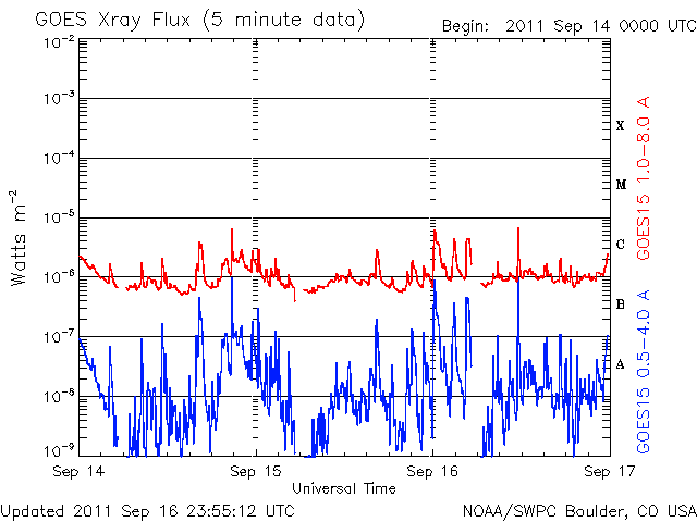 De operationele data in de bovenstaande grafiek werd aangepast om de schaalfactor te verwijderen die werd toegepast door het Space Weather Prediction Center (SWPC). Vanwege de SWPC-schaalfactor in de operationele data werden de zonnevlammen 42% kleiner gerapporteerd dan deze in de wetenschappelijke data. De schaalfactor werd ook verwijderd uit de lijst met zonnevlammen om de werkelijke fysieke eenheden weer te geven.