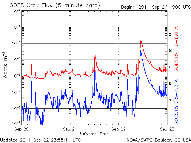 De operationele data in de bovenstaande grafiek werd aangepast om de schaalfactor te verwijderen die werd toegepast door het Space Weather Prediction Center (SWPC). Vanwege de SWPC-schaalfactor in de operationele data werden de zonnevlammen 42% kleiner gerapporteerd dan deze in de wetenschappelijke data. De schaalfactor werd ook verwijderd uit de lijst met zonnevlammen om de werkelijke fysieke eenheden weer te geven.