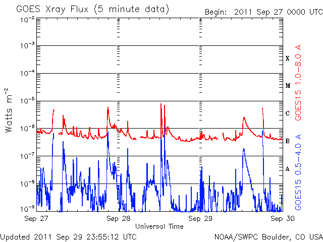 De operationele data in de bovenstaande grafiek werd aangepast om de schaalfactor te verwijderen die werd toegepast door het Space Weather Prediction Center (SWPC). Vanwege de SWPC-schaalfactor in de operationele data werden de zonnevlammen 42% kleiner gerapporteerd dan deze in de wetenschappelijke data. De schaalfactor werd ook verwijderd uit de lijst met zonnevlammen om de werkelijke fysieke eenheden weer te geven.