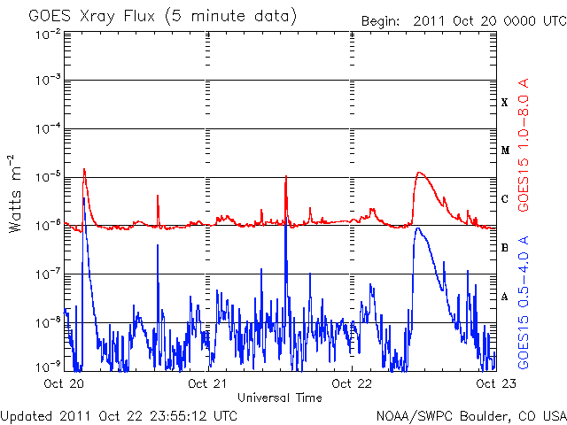 De operationele data in de bovenstaande grafiek werd aangepast om de schaalfactor te verwijderen die werd toegepast door het Space Weather Prediction Center (SWPC). Vanwege de SWPC-schaalfactor in de operationele data werden de zonnevlammen 42% kleiner gerapporteerd dan deze in de wetenschappelijke data. De schaalfactor werd ook verwijderd uit de lijst met zonnevlammen om de werkelijke fysieke eenheden weer te geven.