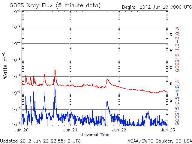 De operationele data in de bovenstaande grafiek werd aangepast om de schaalfactor te verwijderen die werd toegepast door het Space Weather Prediction Center (SWPC). Vanwege de SWPC-schaalfactor in de operationele data werden de zonnevlammen 42% kleiner gerapporteerd dan deze in de wetenschappelijke data. De schaalfactor werd ook verwijderd uit de lijst met zonnevlammen om de werkelijke fysieke eenheden weer te geven.