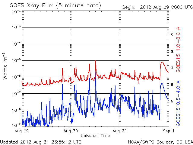 De operationele data in de bovenstaande grafiek werd aangepast om de schaalfactor te verwijderen die werd toegepast door het Space Weather Prediction Center (SWPC). Vanwege de SWPC-schaalfactor in de operationele data werden de zonnevlammen 42% kleiner gerapporteerd dan deze in de wetenschappelijke data. De schaalfactor werd ook verwijderd uit de lijst met zonnevlammen om de werkelijke fysieke eenheden weer te geven.