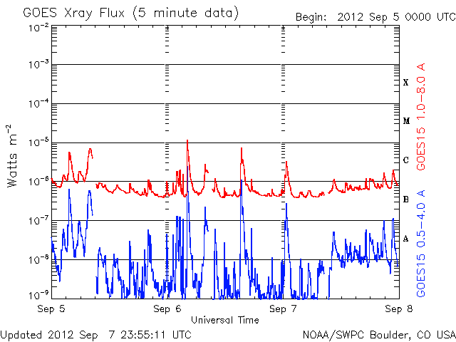 De operationele data in de bovenstaande grafiek werd aangepast om de schaalfactor te verwijderen die werd toegepast door het Space Weather Prediction Center (SWPC). Vanwege de SWPC-schaalfactor in de operationele data werden de zonnevlammen 42% kleiner gerapporteerd dan deze in de wetenschappelijke data. De schaalfactor werd ook verwijderd uit de lijst met zonnevlammen om de werkelijke fysieke eenheden weer te geven.