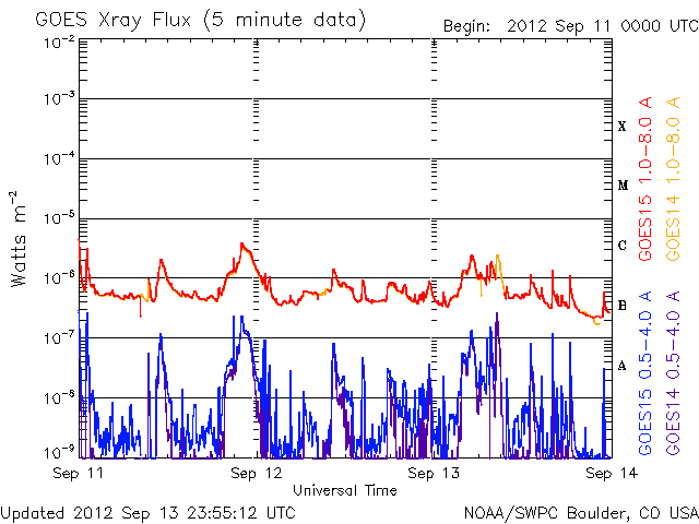 De operationele data in de bovenstaande grafiek werd aangepast om de schaalfactor te verwijderen die werd toegepast door het Space Weather Prediction Center (SWPC). Vanwege de SWPC-schaalfactor in de operationele data werden de zonnevlammen 42% kleiner gerapporteerd dan deze in de wetenschappelijke data. De schaalfactor werd ook verwijderd uit de lijst met zonnevlammen om de werkelijke fysieke eenheden weer te geven.