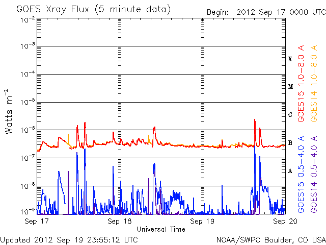 De operationele data in de bovenstaande grafiek werd aangepast om de schaalfactor te verwijderen die werd toegepast door het Space Weather Prediction Center (SWPC). Vanwege de SWPC-schaalfactor in de operationele data werden de zonnevlammen 42% kleiner gerapporteerd dan deze in de wetenschappelijke data. De schaalfactor werd ook verwijderd uit de lijst met zonnevlammen om de werkelijke fysieke eenheden weer te geven.