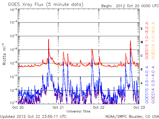 De operationele data in de bovenstaande grafiek werd aangepast om de schaalfactor te verwijderen die werd toegepast door het Space Weather Prediction Center (SWPC). Vanwege de SWPC-schaalfactor in de operationele data werden de zonnevlammen 42% kleiner gerapporteerd dan deze in de wetenschappelijke data. De schaalfactor werd ook verwijderd uit de lijst met zonnevlammen om de werkelijke fysieke eenheden weer te geven.
