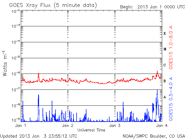 De operationele data in de bovenstaande grafiek werd aangepast om de schaalfactor te verwijderen die werd toegepast door het Space Weather Prediction Center (SWPC). Vanwege de SWPC-schaalfactor in de operationele data werden de zonnevlammen 42% kleiner gerapporteerd dan deze in de wetenschappelijke data. De schaalfactor werd ook verwijderd uit de lijst met zonnevlammen om de werkelijke fysieke eenheden weer te geven.