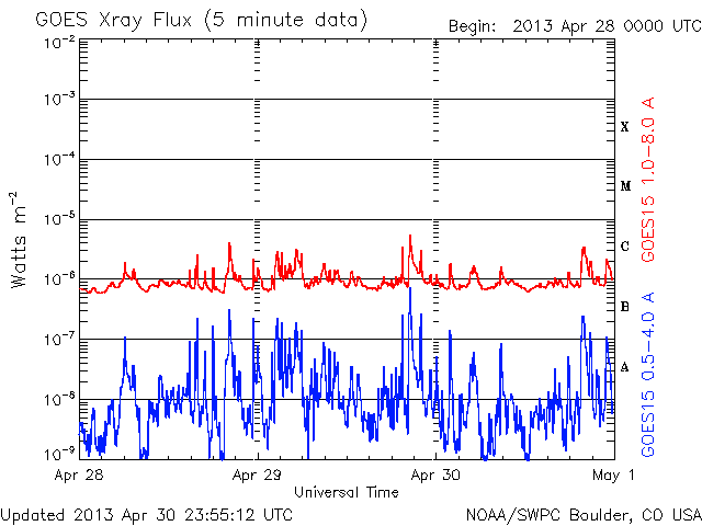 De operationele data in de bovenstaande grafiek werd aangepast om de schaalfactor te verwijderen die werd toegepast door het Space Weather Prediction Center (SWPC). Vanwege de SWPC-schaalfactor in de operationele data werden de zonnevlammen 42% kleiner gerapporteerd dan deze in de wetenschappelijke data. De schaalfactor werd ook verwijderd uit de lijst met zonnevlammen om de werkelijke fysieke eenheden weer te geven.
