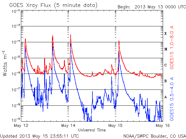 De operationele data in de bovenstaande grafiek werd aangepast om de schaalfactor te verwijderen die werd toegepast door het Space Weather Prediction Center (SWPC). Vanwege de SWPC-schaalfactor in de operationele data werden de zonnevlammen 42% kleiner gerapporteerd dan deze in de wetenschappelijke data. De schaalfactor werd ook verwijderd uit de lijst met zonnevlammen om de werkelijke fysieke eenheden weer te geven.