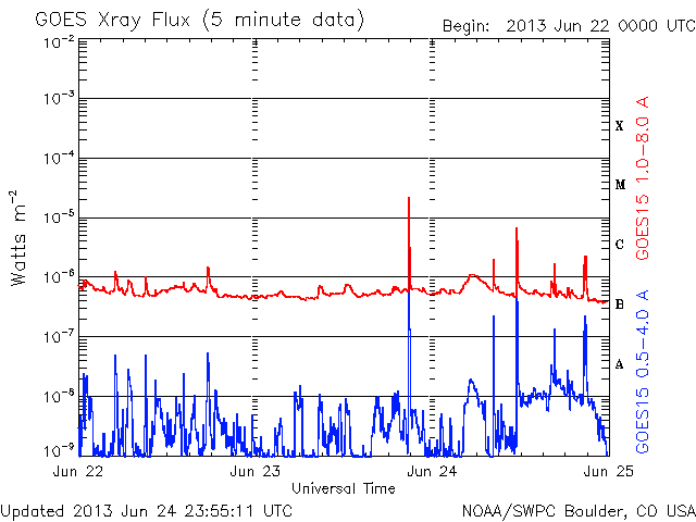 De operationele data in de bovenstaande grafiek werd aangepast om de schaalfactor te verwijderen die werd toegepast door het Space Weather Prediction Center (SWPC). Vanwege de SWPC-schaalfactor in de operationele data werden de zonnevlammen 42% kleiner gerapporteerd dan deze in de wetenschappelijke data. De schaalfactor werd ook verwijderd uit de lijst met zonnevlammen om de werkelijke fysieke eenheden weer te geven.