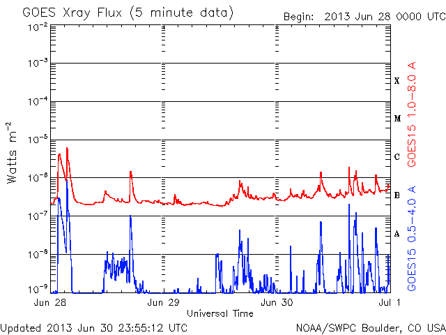 De operationele data in de bovenstaande grafiek werd aangepast om de schaalfactor te verwijderen die werd toegepast door het Space Weather Prediction Center (SWPC). Vanwege de SWPC-schaalfactor in de operationele data werden de zonnevlammen 42% kleiner gerapporteerd dan deze in de wetenschappelijke data. De schaalfactor werd ook verwijderd uit de lijst met zonnevlammen om de werkelijke fysieke eenheden weer te geven.