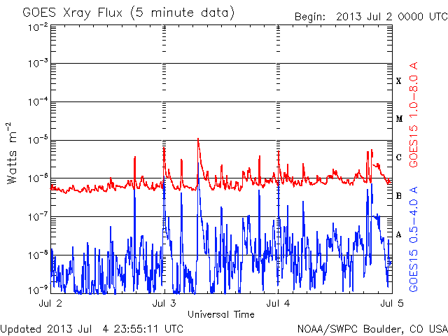 De operationele data in de bovenstaande grafiek werd aangepast om de schaalfactor te verwijderen die werd toegepast door het Space Weather Prediction Center (SWPC). Vanwege de SWPC-schaalfactor in de operationele data werden de zonnevlammen 42% kleiner gerapporteerd dan deze in de wetenschappelijke data. De schaalfactor werd ook verwijderd uit de lijst met zonnevlammen om de werkelijke fysieke eenheden weer te geven.